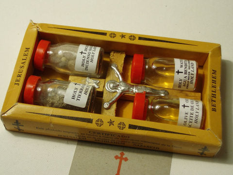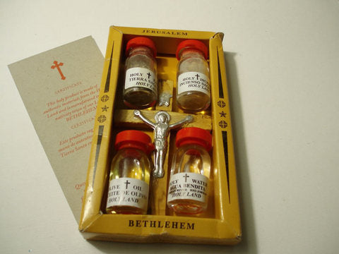 Zertifizierte Schachtel mit Kruzifix, geweihtem Wasser, Olivenoel, Weihrauch und Sand aus Jerusalem (5-teilig)